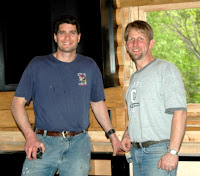 The help arrived in the form of Rob, John and Dennis - the super stainers. The interior needed staining as well and the job seemed pretty daunting for gimpy boy (lots of high country). The guys were great and really fast and worked around our budget. We prepped as much as we could to save time for them and money for us. The stain was tinted slightly to help compensate for the aged logs and the newly installed wood so we would end up with everything looking approximately the same hue. Dennis and the guys did a great job with it and we love the color. You'll like it too.